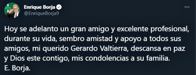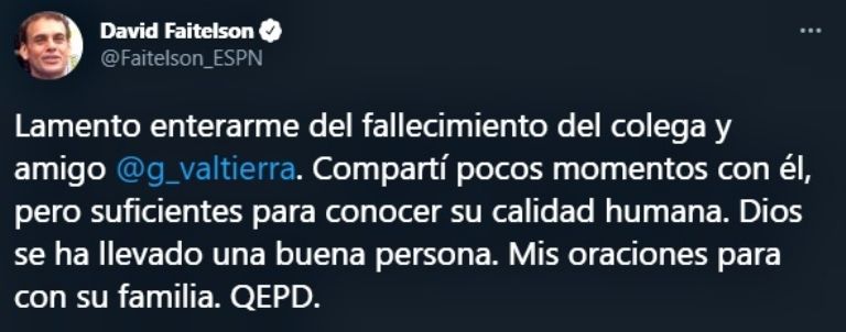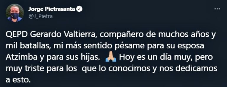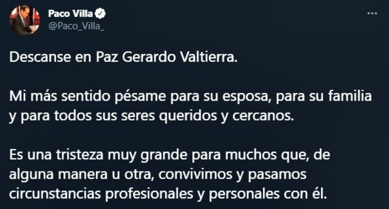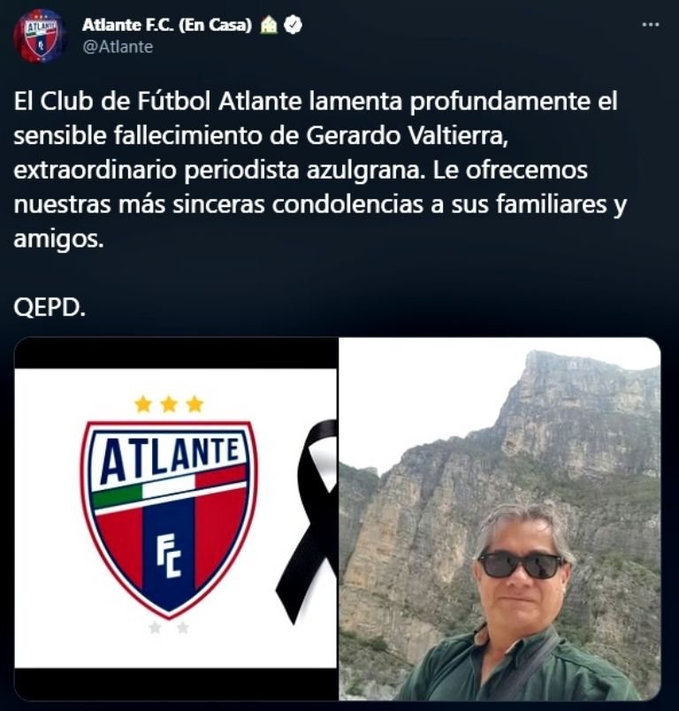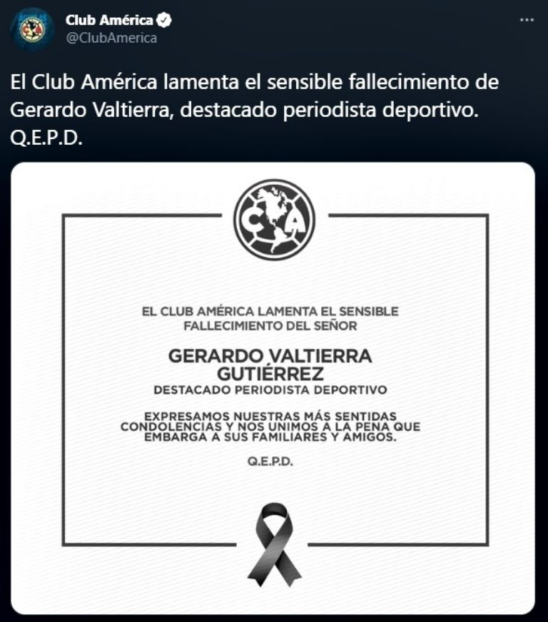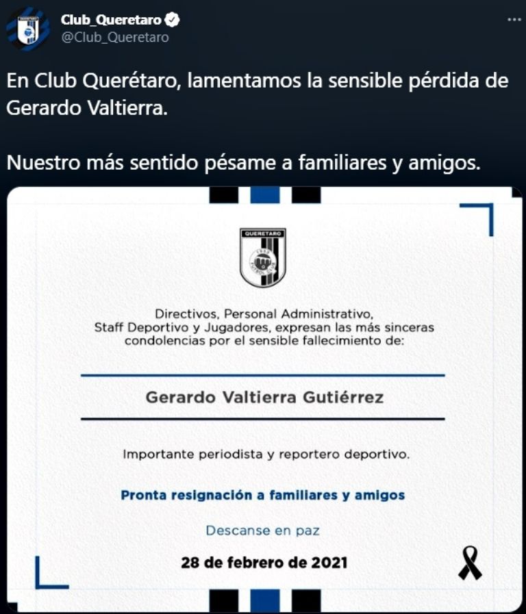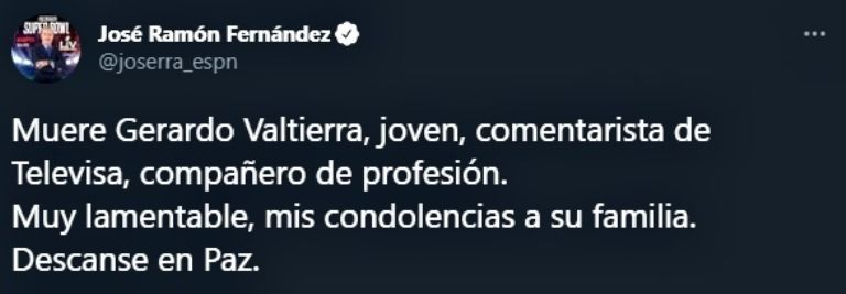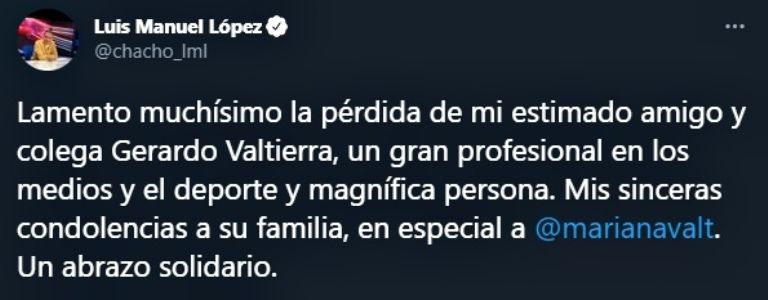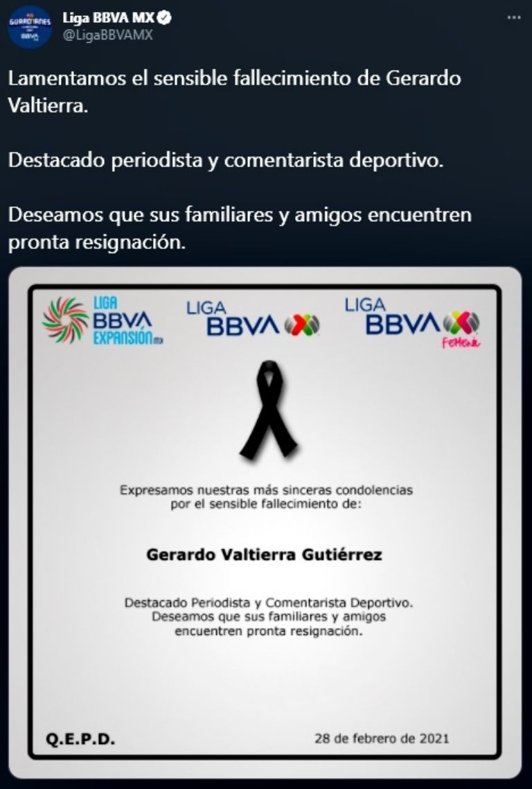 Liga MX mostró su pesar tras conocerse este domingo la muerte de Valtierra. "Lamentamos el sensible fallecimiento de Gerardo Valtierra. Destacado periodista y comentarista deportivo. Deseamos que sus familiares y amigos encuentren pronta resignación", escribieron en Twitter.