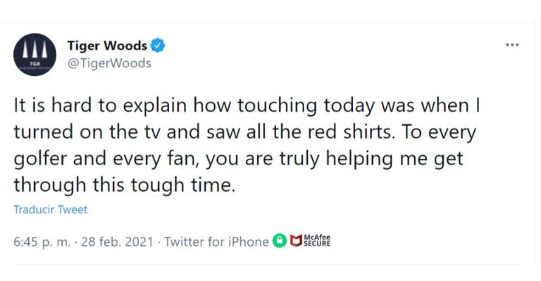 Es difícil explicar lo conmovedor que fue hoy cuando encendí la televisión y vi todas las camisetas rojas. Para todos los golfistas y fanáticos, ustedes realmente me están ayudando a superar este momento difícil", escribió el golfista.