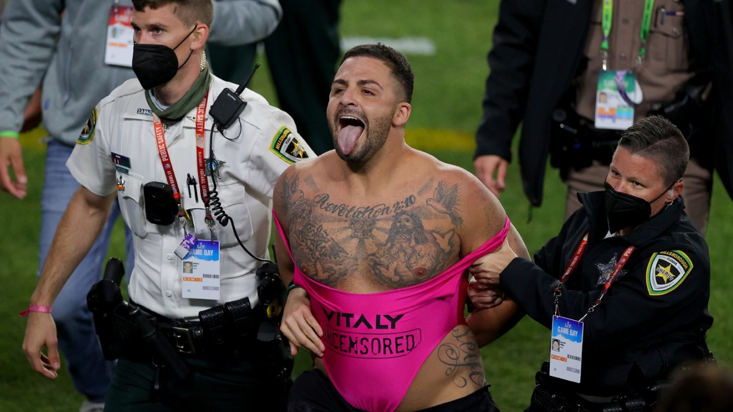 El hombre que interrumpió el Super Bowl LV entró con un bikini color rosa que le hacía publicidad al canal "Vitaly Uncensored", mismo que promocionó la mujer al invadió la final de la UEFA Champions League 2018-19.