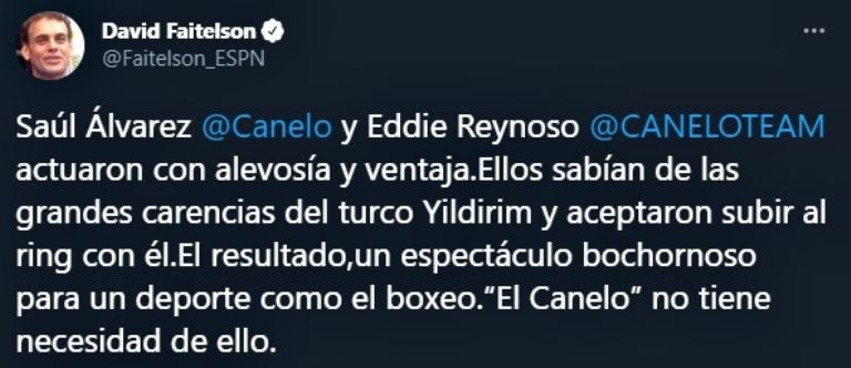 El analista deportivo publicó el siguiente mensaje en Twitter: "Saúl Álvarez @Canelo y Eddie Reynoso @CANELOTEAM actuaron con alevosía y ventaja. Ellos sabían de las grandes carencias del turco Yildirim y aceptaron subir al ring con él. El resultado, un espectáculo bochornoso para un deporte como el boxeo. “El Canelo” no tiene necesidad de ello".