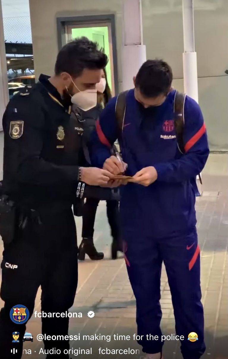 Este momento en que Messi firma un papel a un policía se dio el pasado sábado cuanto toda la plantilla del FC Barcelona llegó a Sevilla para el partido que jugó ante el conjunto andaluz por LaLiga. El argentino se detuvo a firmarle un autógrafo al policía, según revela la publicación del club catalán en sus redes sociales.