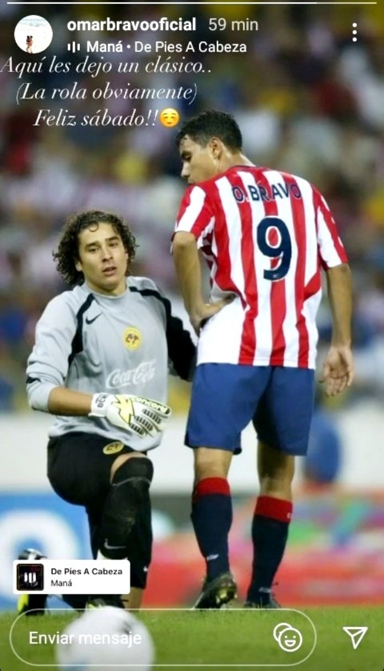 En una historia de Instagram, Omar Bravo publicó una fotografía donde aparece Guillermo Ochoa hincado ante él con una canción de fondo. Se trata del famoso tema de Maná De los pies a la cabeza, una referencia sobre dicho momento en el que el gran goleador hacía de las suyas ante el joven portero.