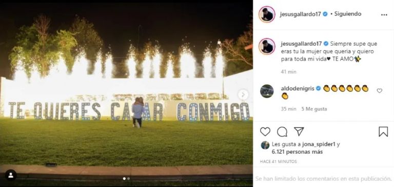 Por medio de su cuenta de Instagram dio a conocer una fotografía en la cual se pueden observar con letras gigantes la frase: "Te quieres casar conmigo", con fuegos artificiales de fondo en el patio de su casa.
