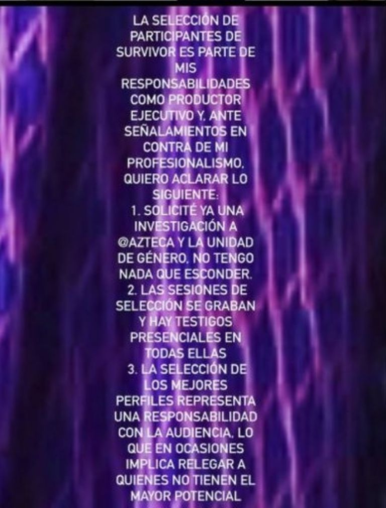 Ante esto el productor publicó un comunicado a través de sus redes sociales, donde se desmarcaba de los comentarios de Halcón Jr, señalando acudiría a la unidad de género de la televisora, pues no tiene nada que esconder.
