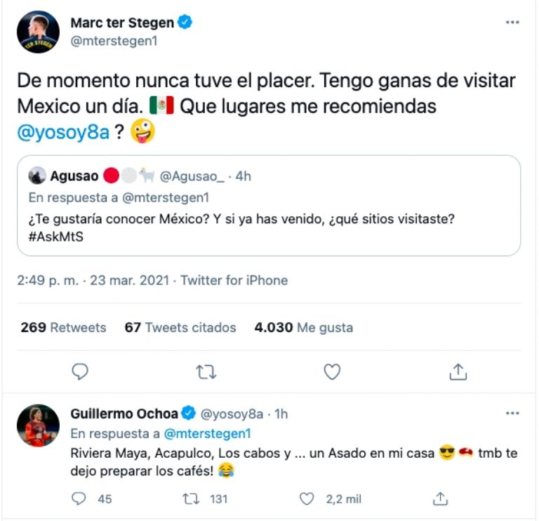 Ter Stegen, quien conoce a Ochoa desde su paso en el Viejo Continente, compartió a través de Twitter su deseo de visitar México de vacaciones y pidió a su colega recomendaciones sobre los mejores lugares para conocer durante su viaje.