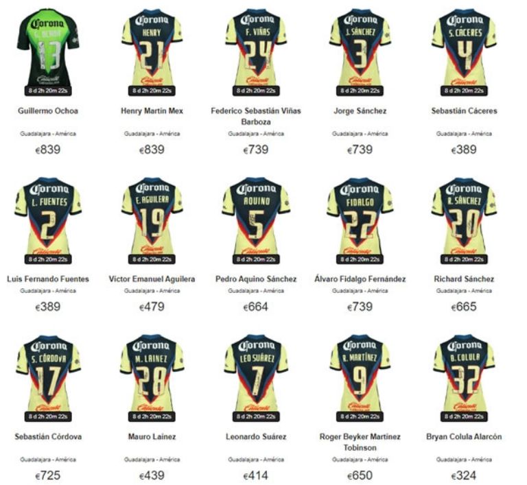 Henry Martín y Guillermo Ochoa fueron las dos figuras de del duelo entre las Águilas y el Rebaño Sagrado, por lo que sus playeras tienen un valor inicial de 839 euros, lo que equivale a 20 mil 420 pesos.