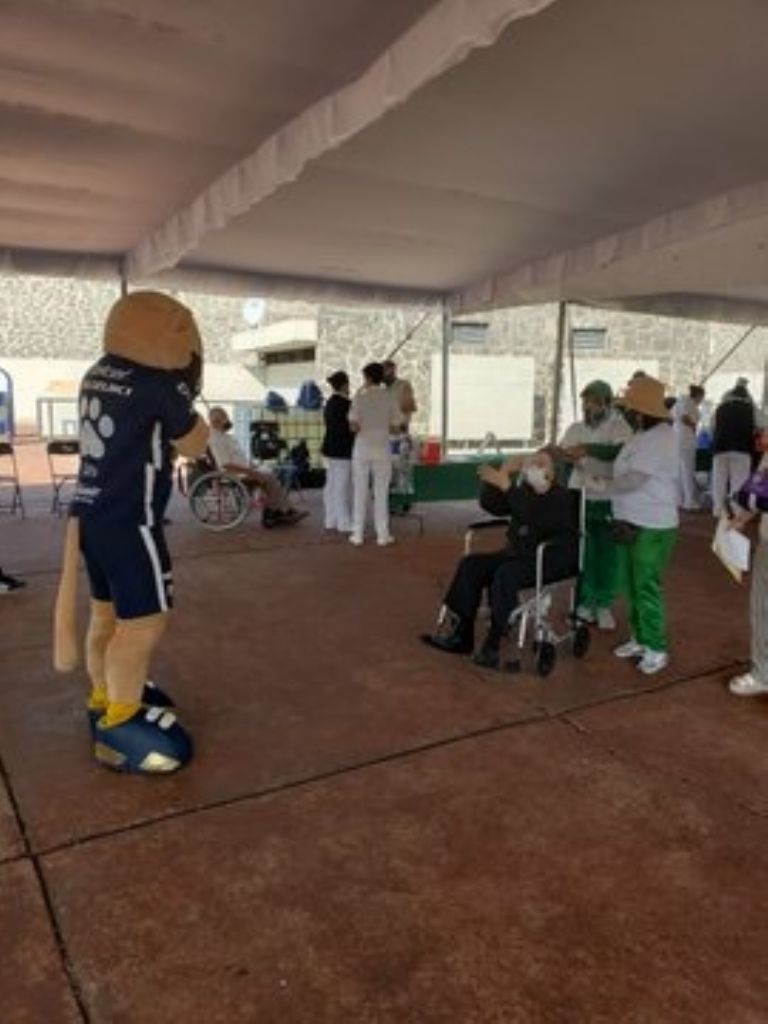 Ahí, en Ciudad Universitaria, la mascota oficial del equipo, Goyo Puma, se sumó a los esfuerzos para apoyar la jornada de vacunación, orientando a las personas de tercera edad para la aplicación de su primera dosis.