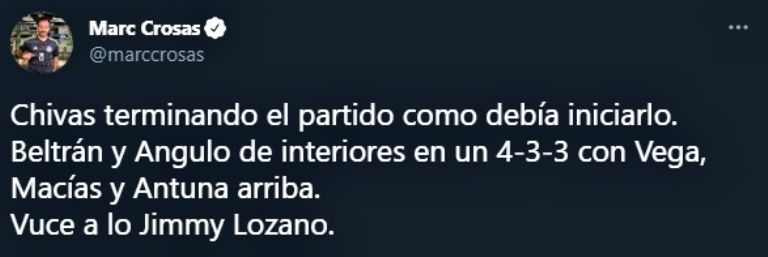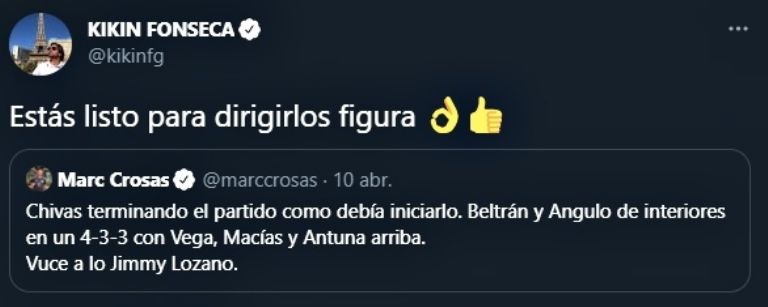 "Chivas terminando el partido como debía iniciarlo. Beltrán y Ángulo de interiores en un 4-3-3 con Vega, Macías y Antuna arriba. Vuce a lo Jimmy Lozano", escribió Crosas. 'Kikin' Fonseca citó su tuit con el siguiente comentario. "Estás listo para dirigirlos, figura".