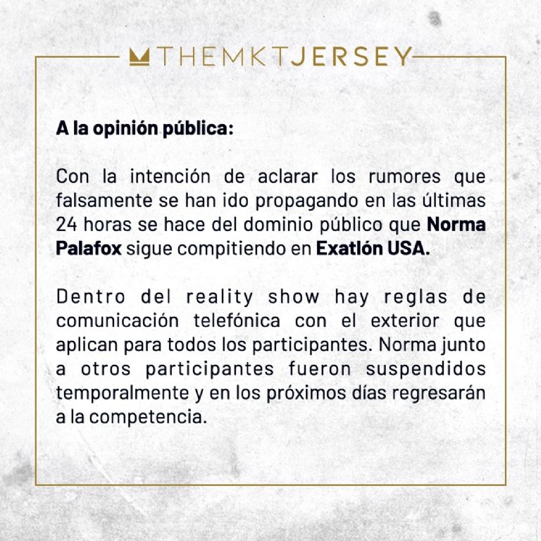 A través de la agencia The Marketing Jersey que la representa, Norma Palafox emitió un comunicado donde aclara el motivo por el cual fue suspendida por tres días en Exatlón Estados Unidos. Esto dicta el escrito: