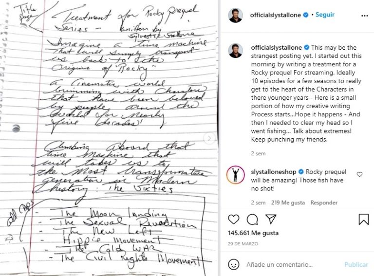 Stallone confirmó hace algunos días atrás a través de publicaciones en su cuenta de Instagram que está trabajando en el guión de una serie que narrará los inicios de Rocky Balboa. Por lo cual, no será lo último que veamos del gran campeón mundial de los pesos pesados en pantalla.