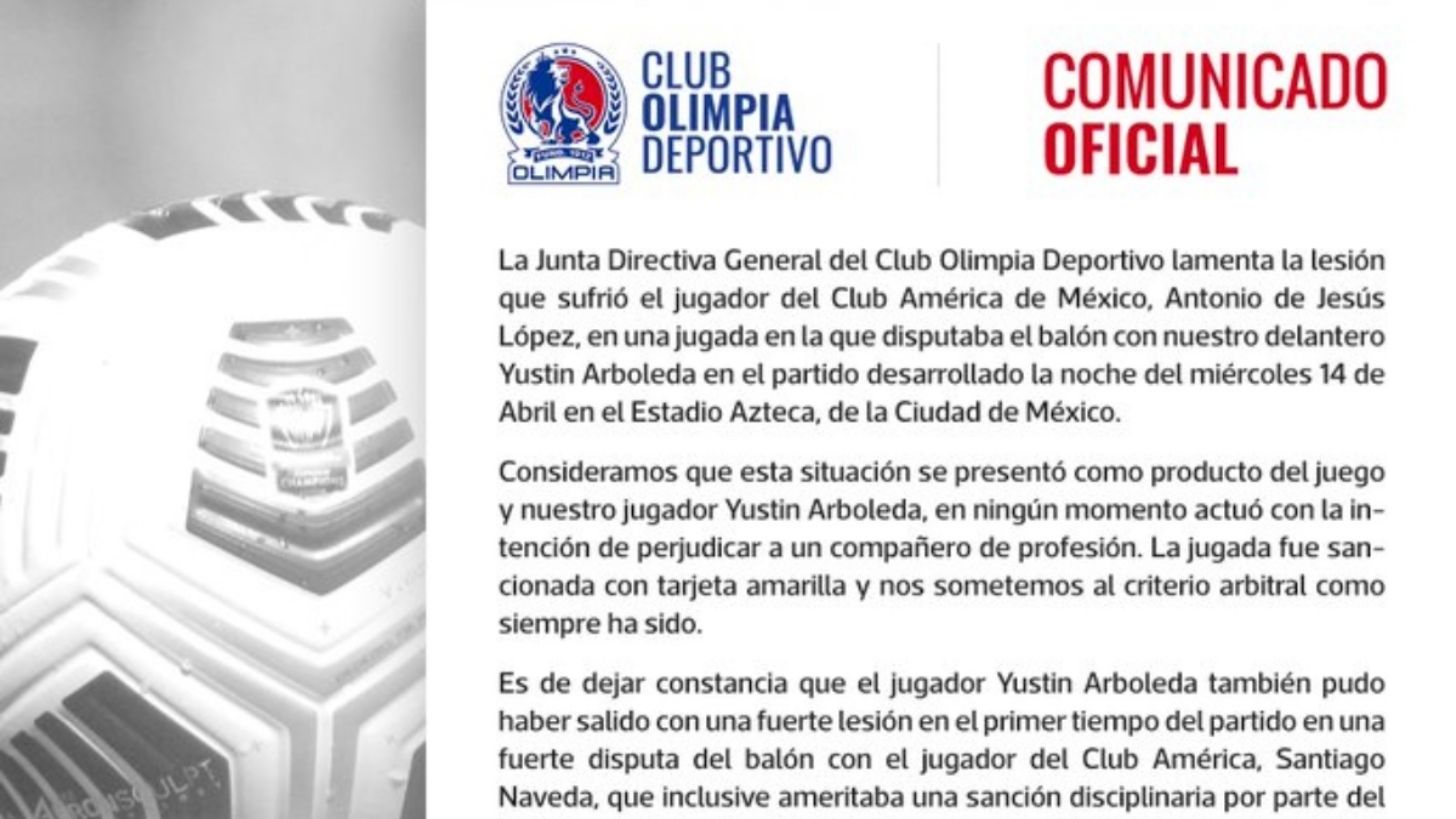 Tras la fractura de peroné que sufrió Jesús López, jugador del América, luego de una entrada de Yustin Arboleda, la Junta Directiva General del Club Olimpia manifestó su postura en redes sociales y consideró que la situación “se presentó como producto del juego”.