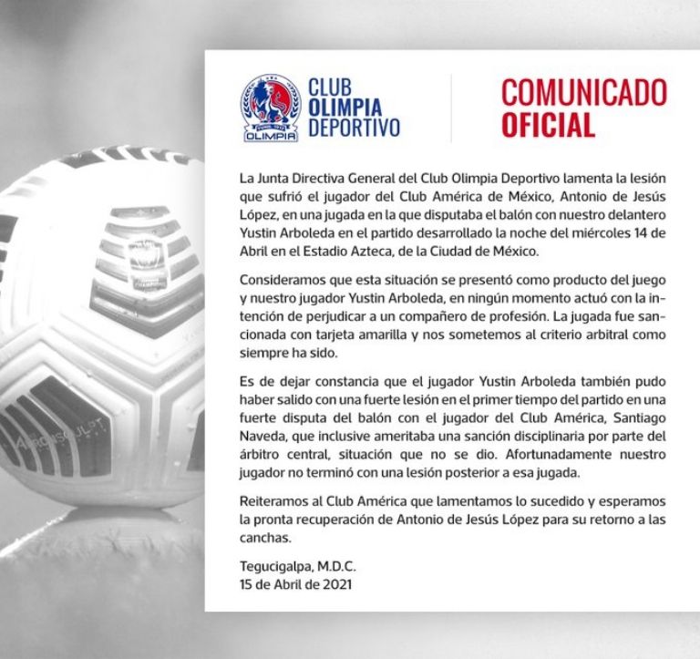 De la misma manera, el Olimpia reiteró sus disculpas a la directiva del América y deseó una pronta recuperación de Jesús López para su retorno a las canchas.