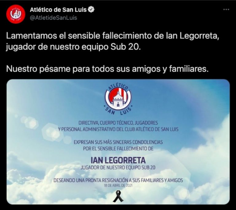 La directiva del Atlético de San Luis dio a conocer este domingo el fallecimiento del jugador de la categoría Sub 20, Ian Legorreta, después de que éste sufriera un accidente automovilístico.