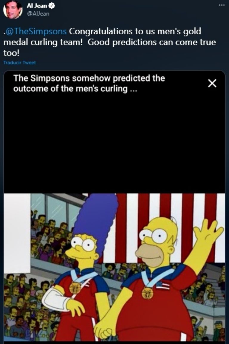 Incluso este hecho fue replicado por uno de los guionistas de la serie, Al Jean, quien felicitó por redes sociales al equipo estadounidense de curling, apelando al éxito de su predicción con Homero y Marge.