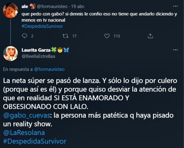 La revelación se dio luego de que Serrath le consultó a Gabo si estaba enamorado de Lalo, ya que fue uno de los participantes con el que más roces tuvo. Sin embargo, Cuevas negó que le guste y afirmó que en realidad es Dennis quien está enamorado de él, según le confesó en una charla que tuvieron.