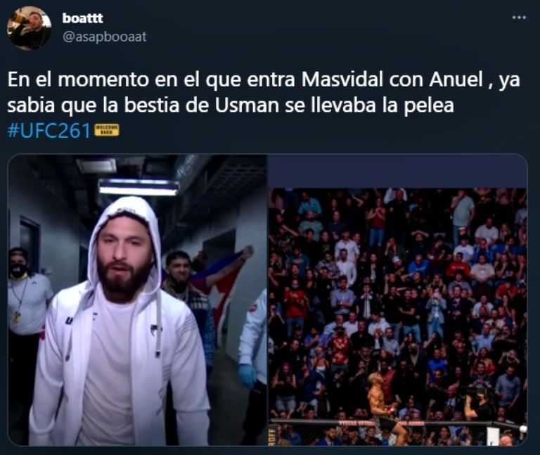 Masvidal es siempre favorito para el público por su nombre, su leyenda y por el carisma que ha mostrado a lo largo de su carrera en las artes marciales mixtas. Sin embargo, desató una ola de comentarios y burlas por ir acompañado a la pelea por el cantante Anuel AA.