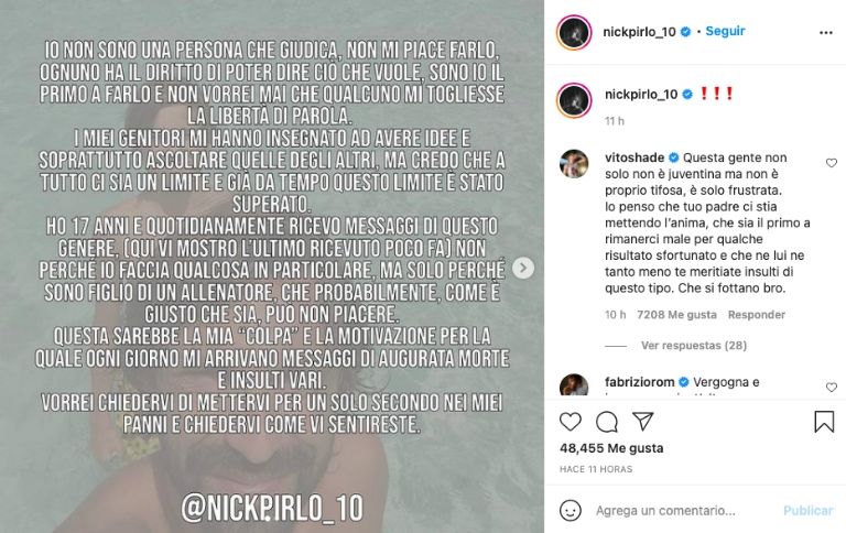 "Tú y tu padre tienen que morir", es el texto de un mensaje recibido por Nicoló Pirlo, quien lo publicó, con una captura de pantalla, en su cuenta de Instagram.