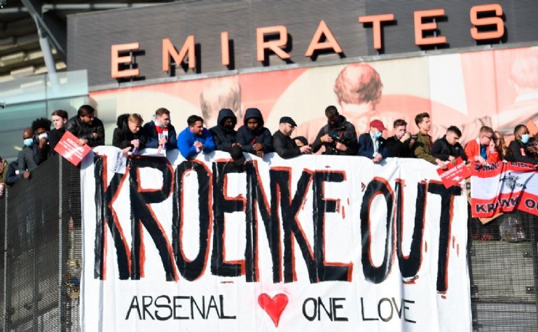 Los aficionados del Arsenal pidieron la salida de Stan Kroenke, dueño del equipo, debido a que fue uno de los instigadores en el fallido proyecto de la Superliga europea, además de que el paso del club no ha sido el mejor desde que está bajo su mando.