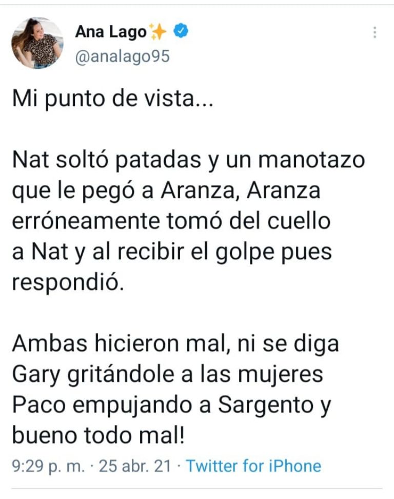 "Mi punto de vista. Nat soltó patadas y un manotazo que le pegó a Aranza, Aranza erróneamente tomó del cuello a Nat y al recibir el golpe pues respondió. Ambas hicieron mal, ni se diga Gary gritándole a las mujeres, Paco empujando a Sargento y bueno todo mal", escribió la atleta.