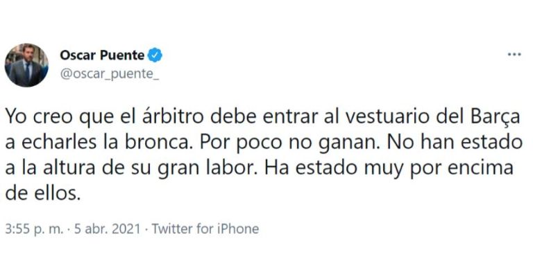 El futbol trasciende más allá de las esferas deportivas y de los aficionados, hasta alcanzar las escalas políticas, como en esta ocasión, donde el alcalde de Valladolid, Óscar Puente no aguantó la pasión y se dejó llevar en redes sociales por las que consideró injusticias arbitrales.