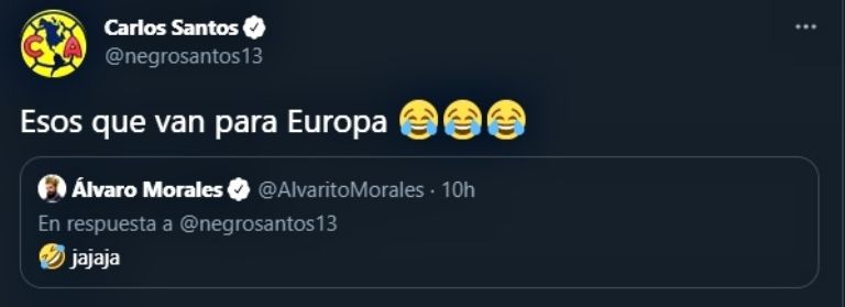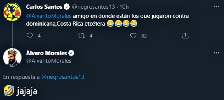 "@AlvaritoMorales amigo en dónde están los que jugaron contra Dominicana, Costa Rica etcétera", comentó Santos mencionando al periodista. Morales respondió con risas, a lo que el 'Negro' remató: "Esos que van para Europa".