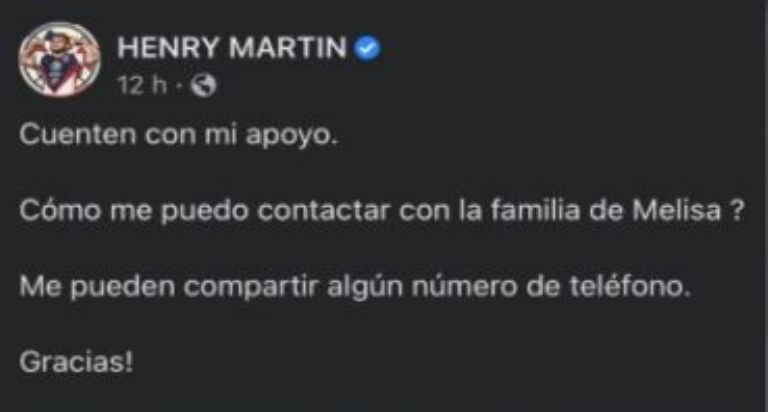 "Cuenten con mi apoyo. Cómo me puedo contactar con la familia de Melisa. Me pueden compartir algún número de teléfono. Gracias", respondió el delantero de las Águilas.