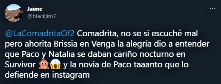 En esta ocasión, las redes dan cuenta de un presunto amorío que habría nacido en la tribu verde de los Halcones. Los involucrados serían el actor Paco Pizaña y su colega Natalia Alcocer, dos de los integrantes más polémicos dentro del programa, pero que han demostrado cierta complicidad y algunas actitudes que dan a pensar en que puede haber algo más que sólo buena onda en la competencia.