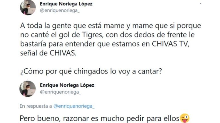 A toda la gente que está mame y mame que si porque no canté el gol de Tigres, con dos dedos de frente le bastaría para entender que estamos en CHIVAS TV, señal de CHIVAS. ¿Cómo por qué chingados lo voy a cantar?", escribió en su cuenta de Twitter.