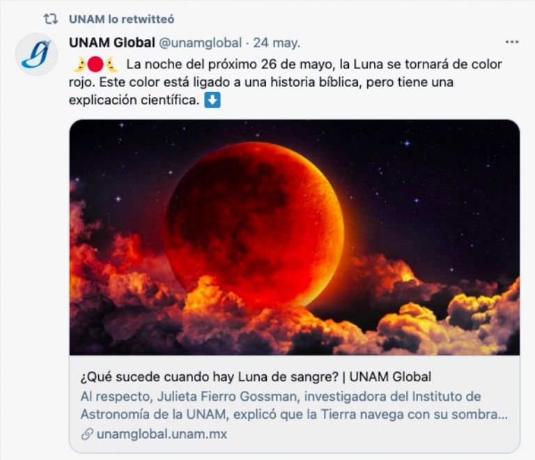 La Universidad Nacional Autónoma de México (UNAM) se unió a la fiesta astronómica por el eclipse total de Luna de Sangre, además de la superluna y la Luna de Flores, fenómenos que ocurrirán el mismo miércoles.