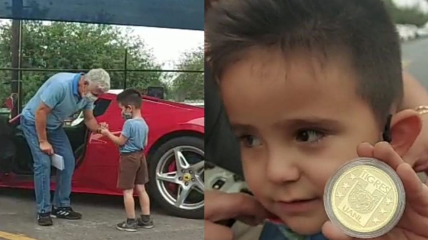 Tras descender de su lujoso coche deportivo, Ferretti le alegró el día a un pequeño aficionado felino al regalarle una medalla conmemorativa que recibió tras vencer al Monterrey en la Final Regia del Apertura 2017.