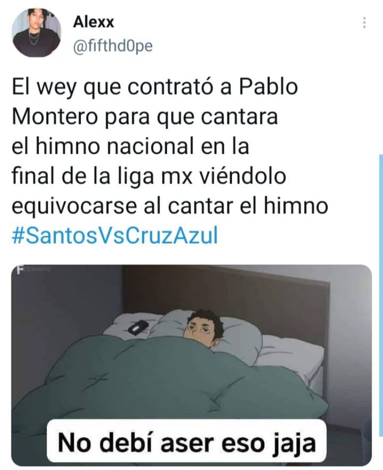 La pifia cometida por Pablo Montero en su interpretación del Himno Nacional, fue el tema más comentado en redes sociales durante la final Santos vs Cruz Azul. Y es que el público aprovechó para publicar los tradicionales memes dejando el partido en un segundo plano.