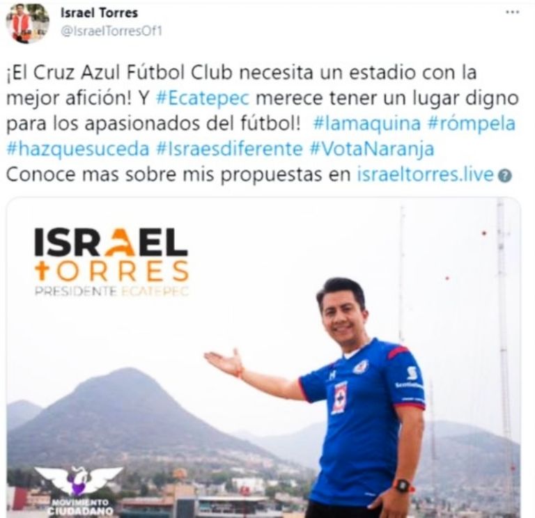 ¡El Cruz Azul Fútbol Club necesita un estadio con la mejor afición! Y #Ecatepec merece tener un lugar digno para los apasionados del fútbol. Como candidato a la Alcaldía por Movimiento Ciudadano, propongo dar todas las facilidades para que el Azul construya su estadio en Ecatepec, como Presidente lo cumpliré”, se lee en la propaganda del candidato.