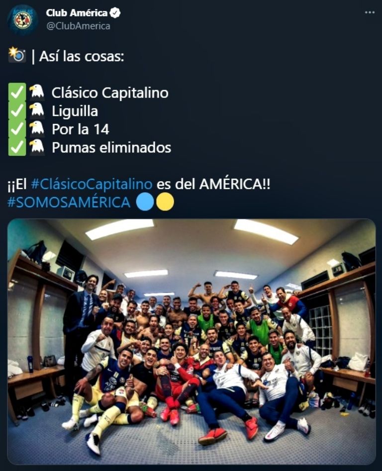 Es que el CM del Twitter de América enumeró la victoria en el clásico, el pase a la Liguilla, la posibilidad de ir por el décimo cuarto título de Liga MX y, sobre todo, el hecho de que eliminaron a Pumas de la Pelea Grande.
