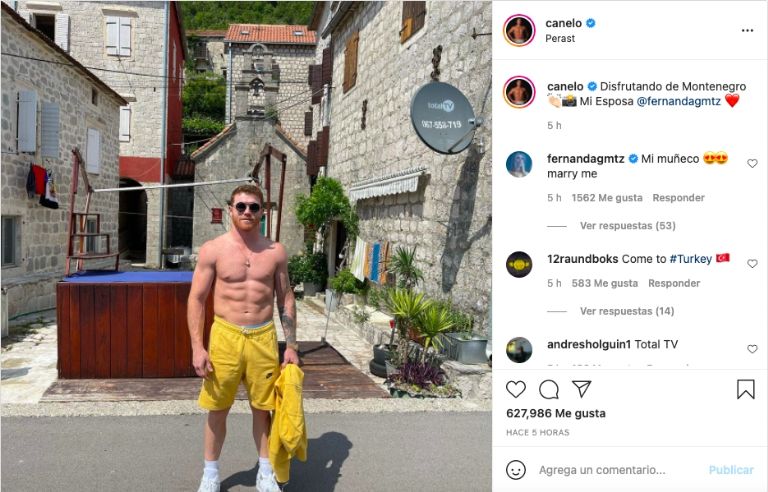 El púgil tapatío subió una Instagram Storie en la que se le puede ver bebiendo unas copas de vino y etiquetó a Fernanda, mientras en una segunda postal, señala que se encuentra en Savina, Montenegro.