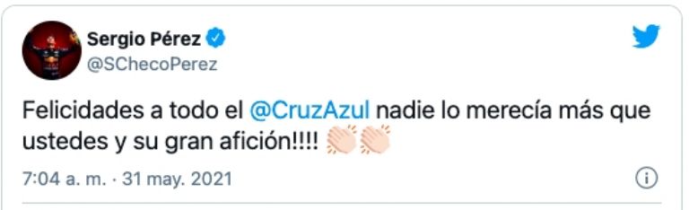 "Felicidades a todo el Cruz Azul. ¡Nadie lo merecía más que ustedes y su gran afición!", compartió Checo en sus redes sociales.