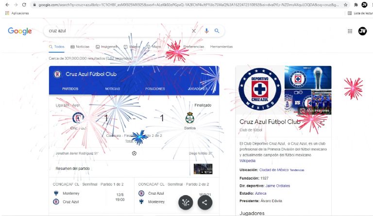 Tras haberse coronado, al momento de buscar en Google Cruz Azul, al mostrar el resultado de la búsqueda, te muestra una animación de fuegos artificiales con los colores del equipo.