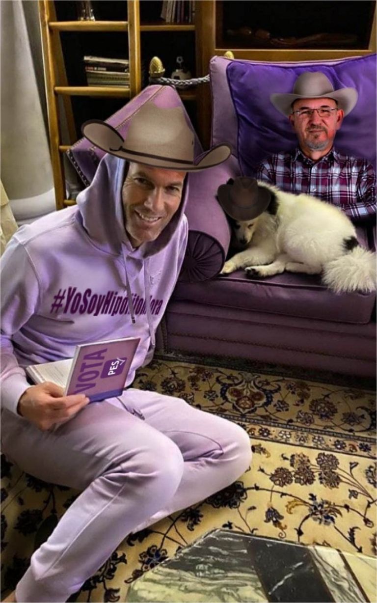 Aparece Zidane con una libreta que tiene el logo del partido, sombrero como el candidato y la imagen de Hipólito Mora en uno de los cojines de su sillón.