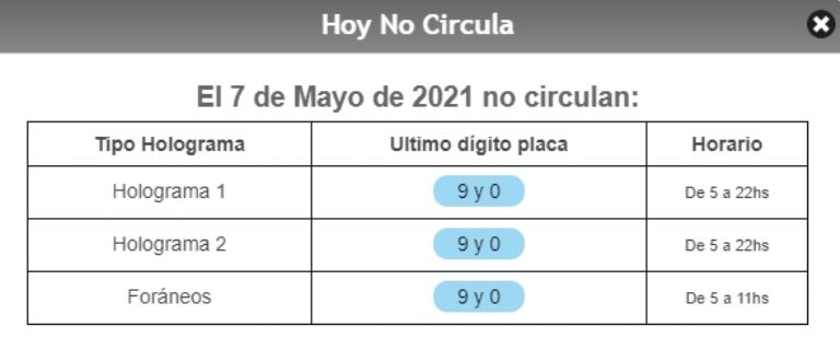 Este viernes 7 de mayo el programa Hoy No Circula en la Ciudad de México y Estado de México, se aplicará a los autos con holograma 1 y 2, terminación de placas 9 y 0 engomado azul.