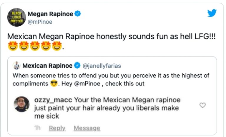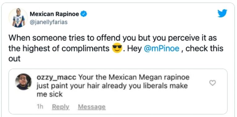 “Eres la mexicana Megan Rapinoe, sólo píntate el pelo. Los liberales me enferman”, escribió el usuario.