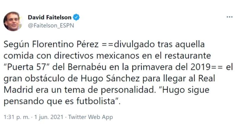 Según Florentino Pérez ==divulgado tras aquella comida con directivos mexicanos en el restaurante “Puerta 57” del Bernabéu en la primavera del 2019== el gran obstáculo de Hugo Sánchez para llegar al Real Madrid era un tema de personalidad. 'Hugo sigue pensando que es futbolista'", escribió el periodista en su cuenta de Twitter.