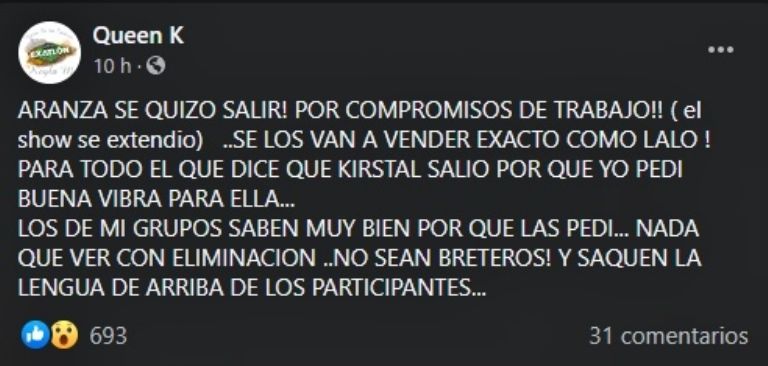 Y esto será así, ya que la propia cuenta de spoilers revela que saldrá tal como sucedió con Eduardo Barquín, quien también salió del reality eliminado en Juego de la Extinción. Su derrota en este duelo final sorprendió, ya que se trataba de uno de los competidores que más puntos daba a su tribu, Jaguares. De hecho, se vieron varios comentarios de que supuestamente Lalo se dejó ganar, aunque no se conocían los motivos.