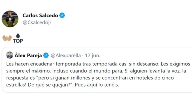 Les hacen encadenar temporada tras temporada casi sin descanso. Les exigimos siempre el máximo, incluso cuando el mundo para. Si alguien levanta la voz, la respuesta es "pero si ganan millones y se concentran en hoteles de cinco estrellas! De qué se quejan?". Pues aquí lo tenéis", escribió el periodista español en Twitter.