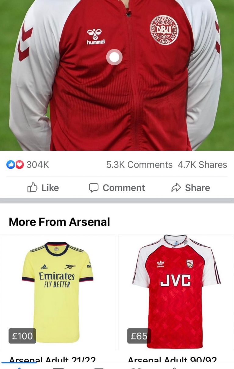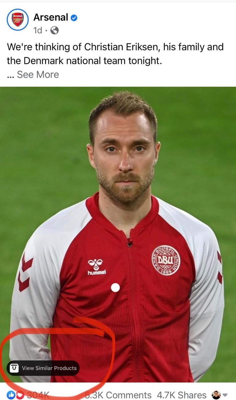 Muy vergonzoso de Facebook (o tal vez solo un percance de Arsenal) por permitir la venta de merchandising en un mensaje dirigido a Eriksen y su familia. Espero que corrijan eso", publicó un usuario en Twitter junto a las fotos donde marcaba lo dicho.