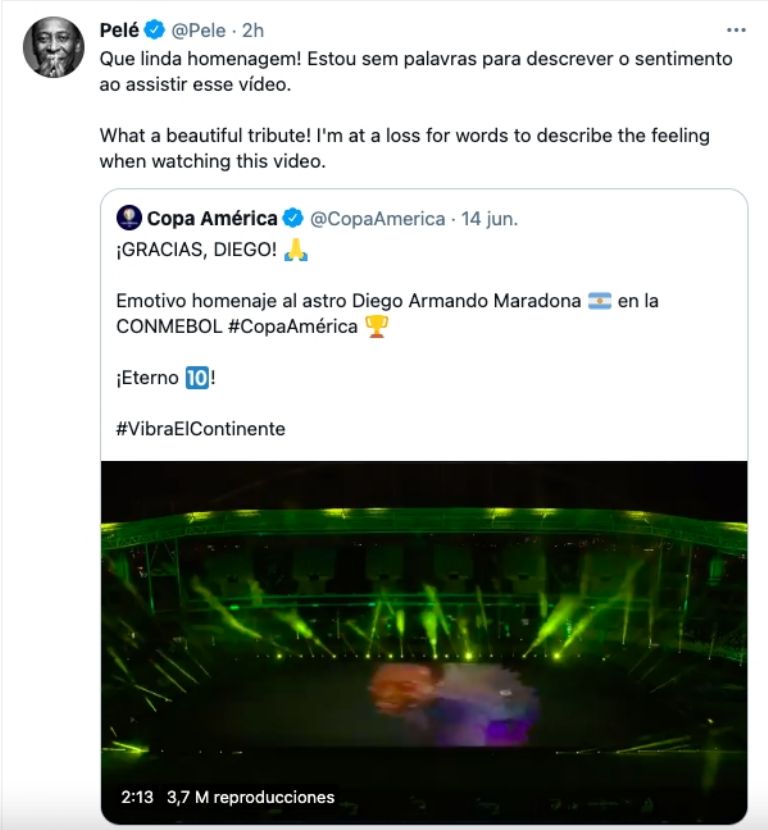 El exastro de la selección brasileña, Edson Arantes do Nascimento 'Pelé', celebró este martes el homenaje que la Conmebol realizó al fallecido excapitán de Argentina, Diego Maradona, antes del debut de la Albiceleste en la Copa América que se disputa en su país.