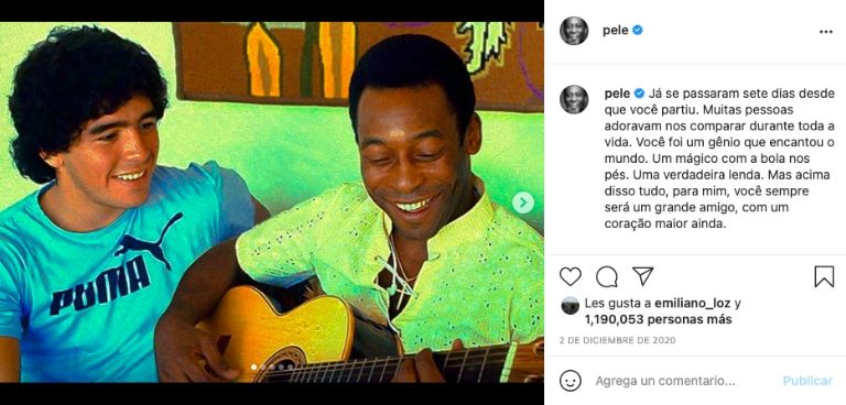 A una semana de su muerte, O Rei decidió hacerle un tributo al ‘Pelusa’ con una carta publicada en sus redes sociales. En ella, con una fuerte carga emotiva, deseó volver a verlo en el cielo para “algún día patear juntos una pelota”.