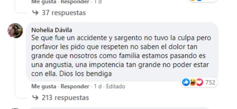 “Sé que fue un accidente y Sargento no tuvo la culpa, pero por favor les pido que respeten no saben el dolor tan grande que nosotros como familia estamos pasando es una angustia, una impotencia tan grande no poder estar con ella. Dios los bendiga”, escribió la madre de Silva en la cuenta de Facebook del programa.