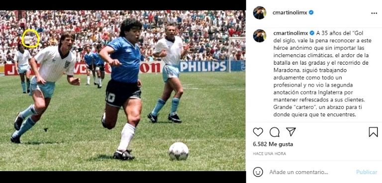 "A 35 años del “Gol del siglo, vale la pena reconocer a este héroe anónimo que sin importar las inclemencias climáticas, el ardor de la batalla en las gradas y el recorrido de Maradona, siguió trabajando arduamente como todo un profesional y no vio la segunda anotación contra Inglaterra por mantener refrescados a sus clientes. Grande 'cartero', un abrazo para ti donde quiera que te encuentres", escribió Martinoli en su cuenta de Instagram en referencia al 'cartero' que no vio el gol de Maradona y estaba trabajando en las gradas del Estadio Azteca.