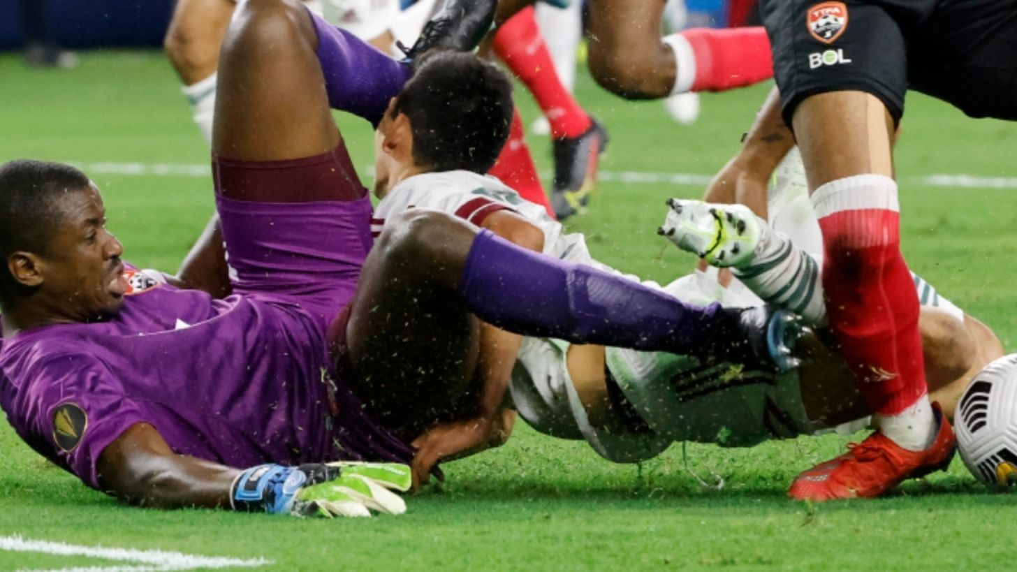Fue apenas al minuto 10 del encuentro cuando Lozano entró al área y fue empujado por un defensa trinitario, lo que provocó que el jugador mexicano cayera de frente y al momento de ir hacia el césped se estrellara con las rodillas del portero caribeño. La velocidad en la que iba hace que el golpe sea más duro.