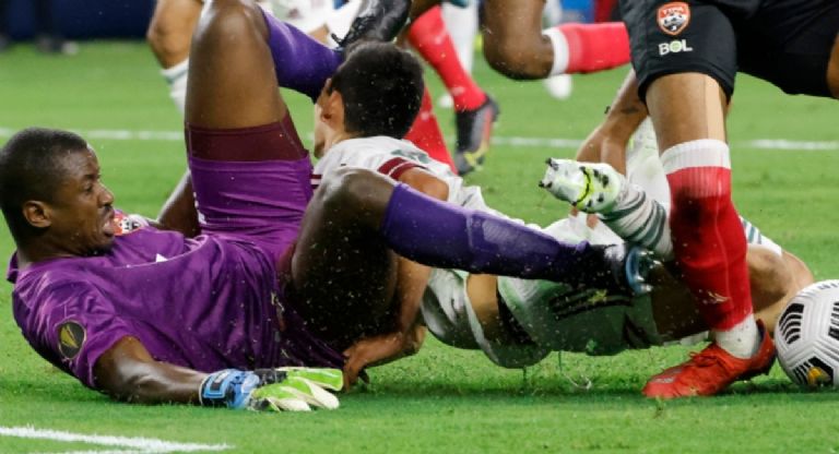 Fue apenas al minuto 10 del encuentro cuando Lozano entró al área y fue empujado por un defensa trinitario, lo que provocó que el jugador mexicano cayera de frente y al momento de ir hacia el césped se estrellara con las rodillas del portero caribeño. La velocidad en la que iba hace que el golpe sea más duro.
