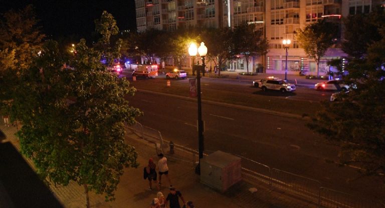 Una treintena de policías, vehículos, ambulancias y camiones de bomberos estaban en la calle aledaña al Nationals Park, por el lado de la antesala. Más tarde, la policía de Washington tuiteó:
